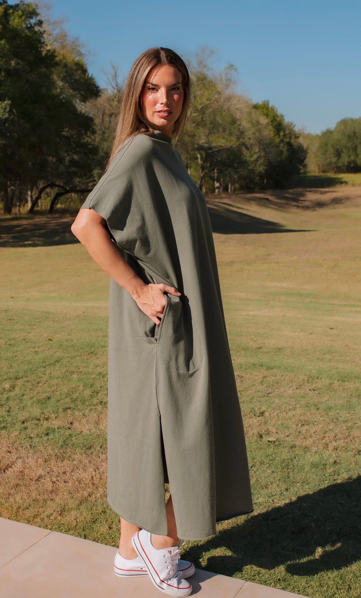 We are crazy about our soft comfy Knit tops.  This Maxi dress is simple, modern,  sophisticated and sports a stylish funnel neck.  It also has pockets!  All edges are raw and there is contrast stitching.