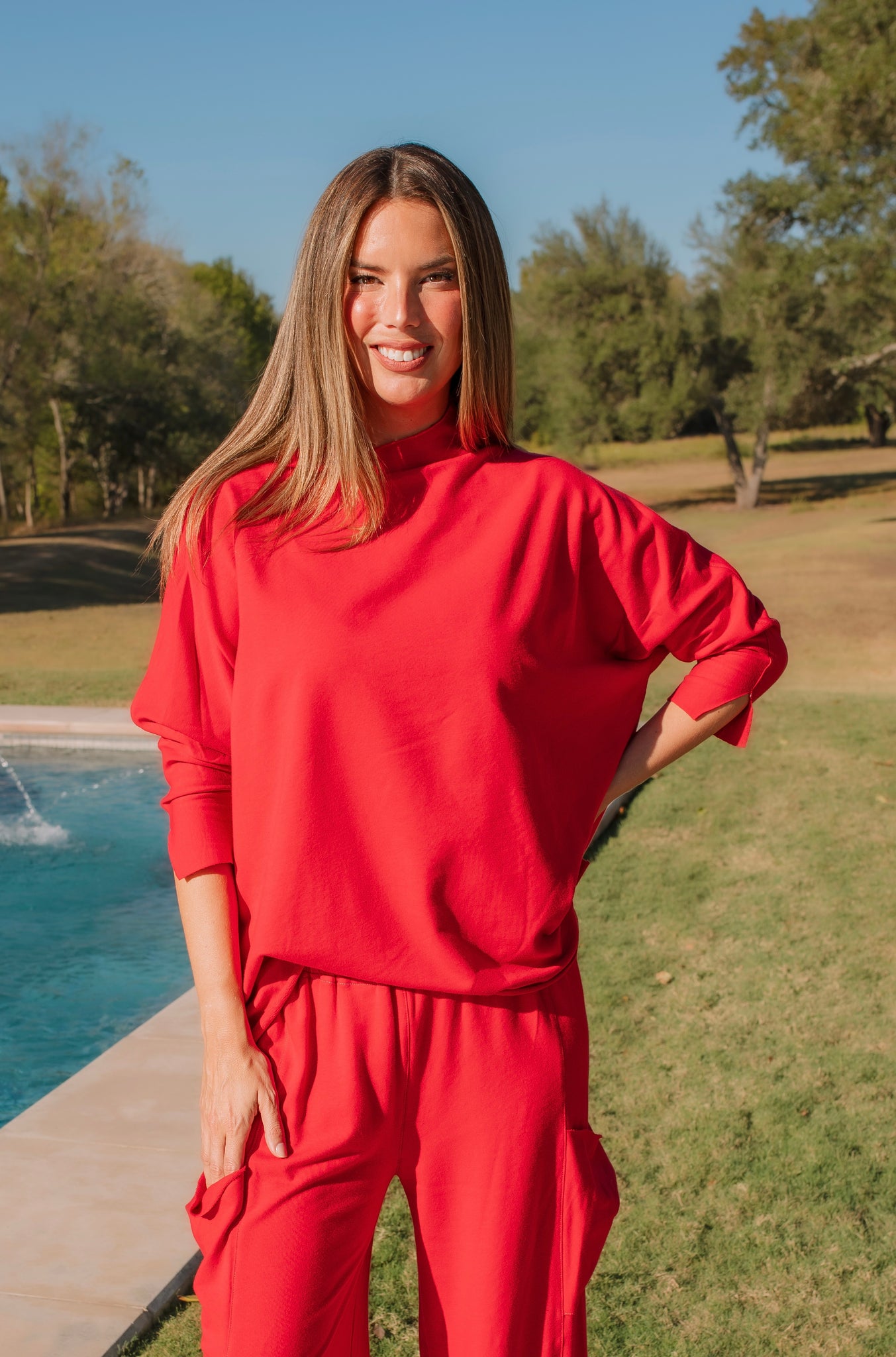 We are crazy about our soft comfy Knit tops. This long sleeve style is simple, modern, sophisticated and sports a stylish funnel neck. All edges are raw and there is contrast stitching.
