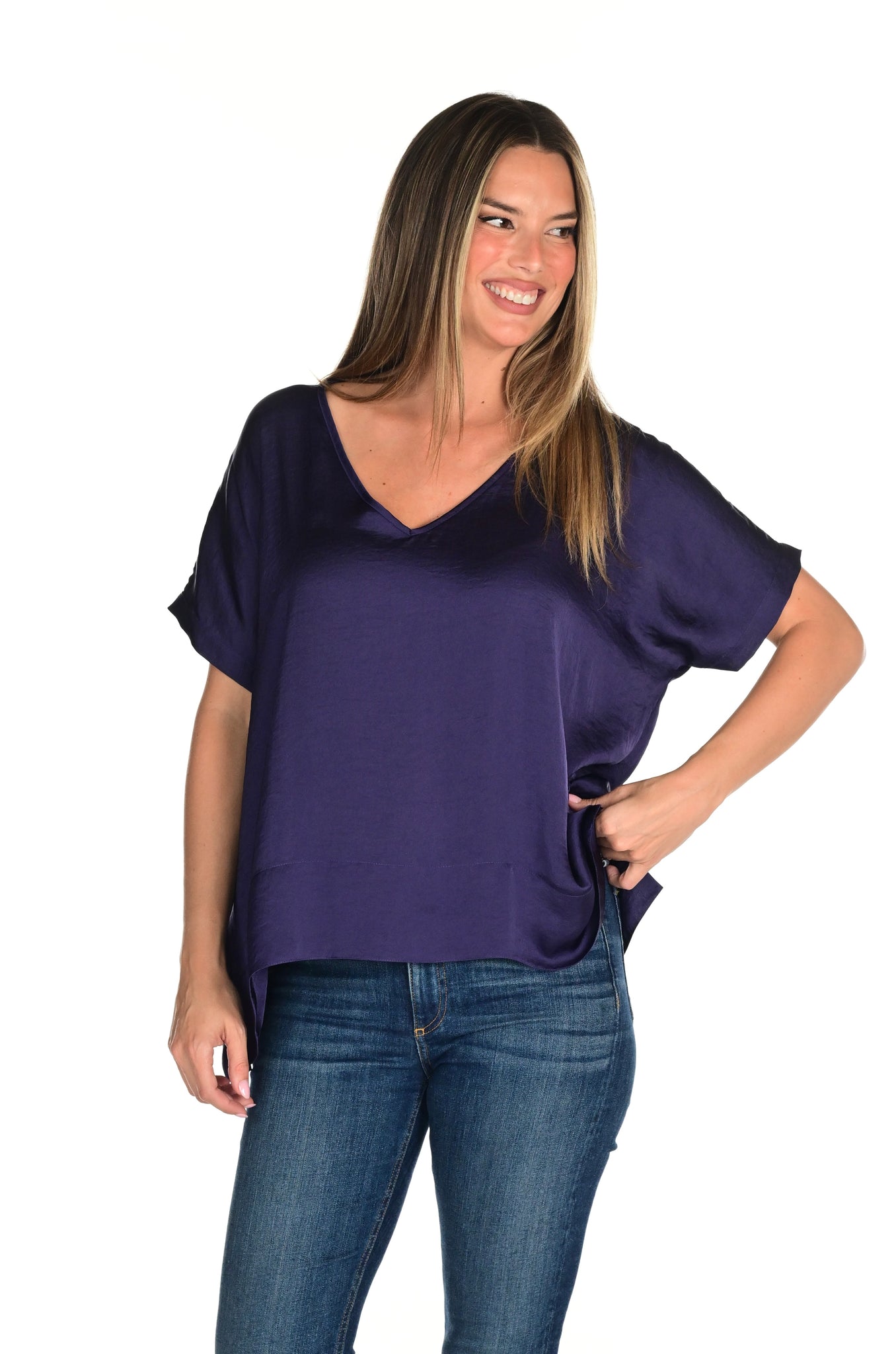 Simple everyday style. This is our version of a must have t-shirt. V-neck, side slit, big hem......perfect with jeans, shorts, and skirts! It comes sized in four sizes, XS, S, M, L, so you can get the perfect fit.